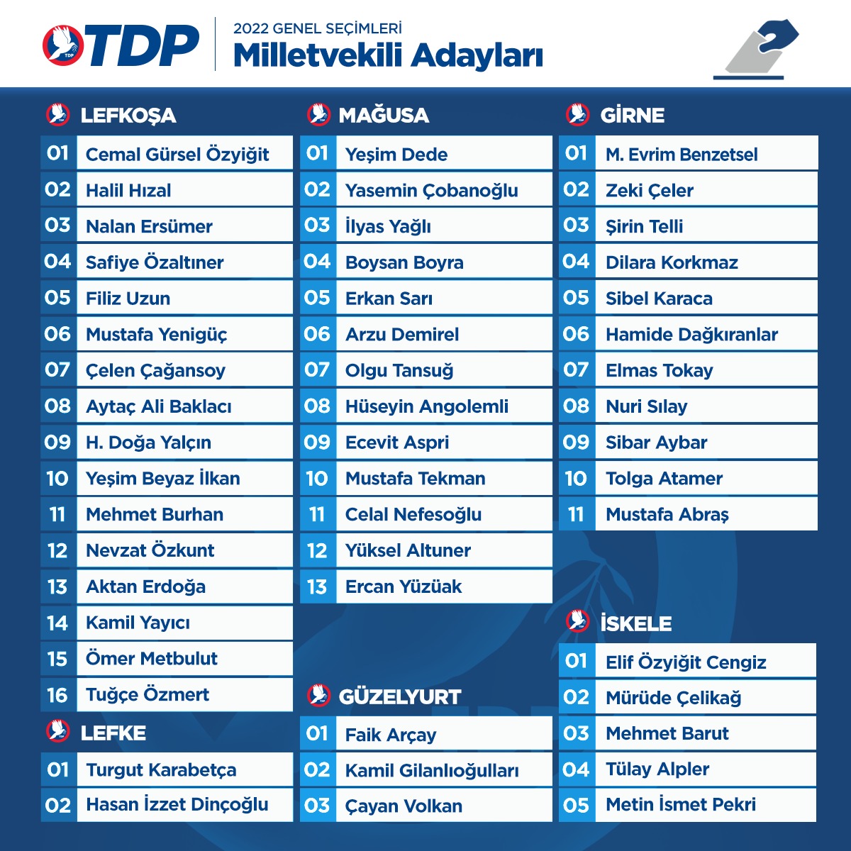 Partiden yapılan açıklamaya göre, TDP’nin 50 kişilik milletvekili adayları ve sıralamaları ilçelere göre şöyle: